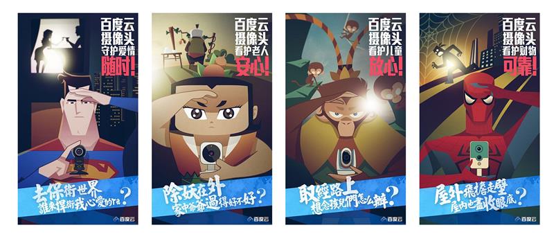 1. 百度云攝像頭的幾張大海報,幾個關鍵詞:隨時、安心、放心、可靠,海報中的人物都是家喻戶曉的superstar,并且整個頁面有一定的故事性和想象空間,讓人印象很深刻,并且調(diào)起了好奇心。