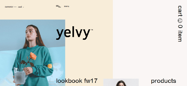 Yelvy是加拿大服飾品牌。顯然,他們的網(wǎng)站非常時尚,這并不影響其導航的價值。本網(wǎng)站是商品展示的輔助元素,不會分散用戶購買的注意力。