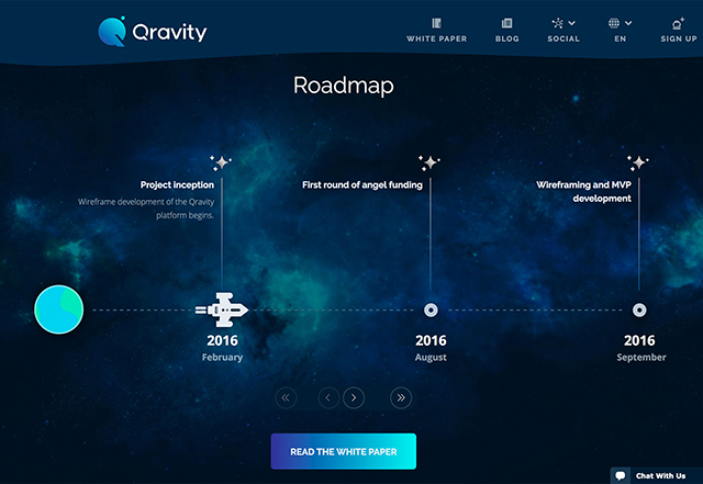 Qravity網(wǎng)站設(shè)計(jì)中有多個數(shù)據(jù)入口點(diǎn),其中最有趣的可能是滾動條下面的動畫時間線。這種以可視化方式組織信息(日期和事件)的方法使得信息比簡單的列表更容易理解。